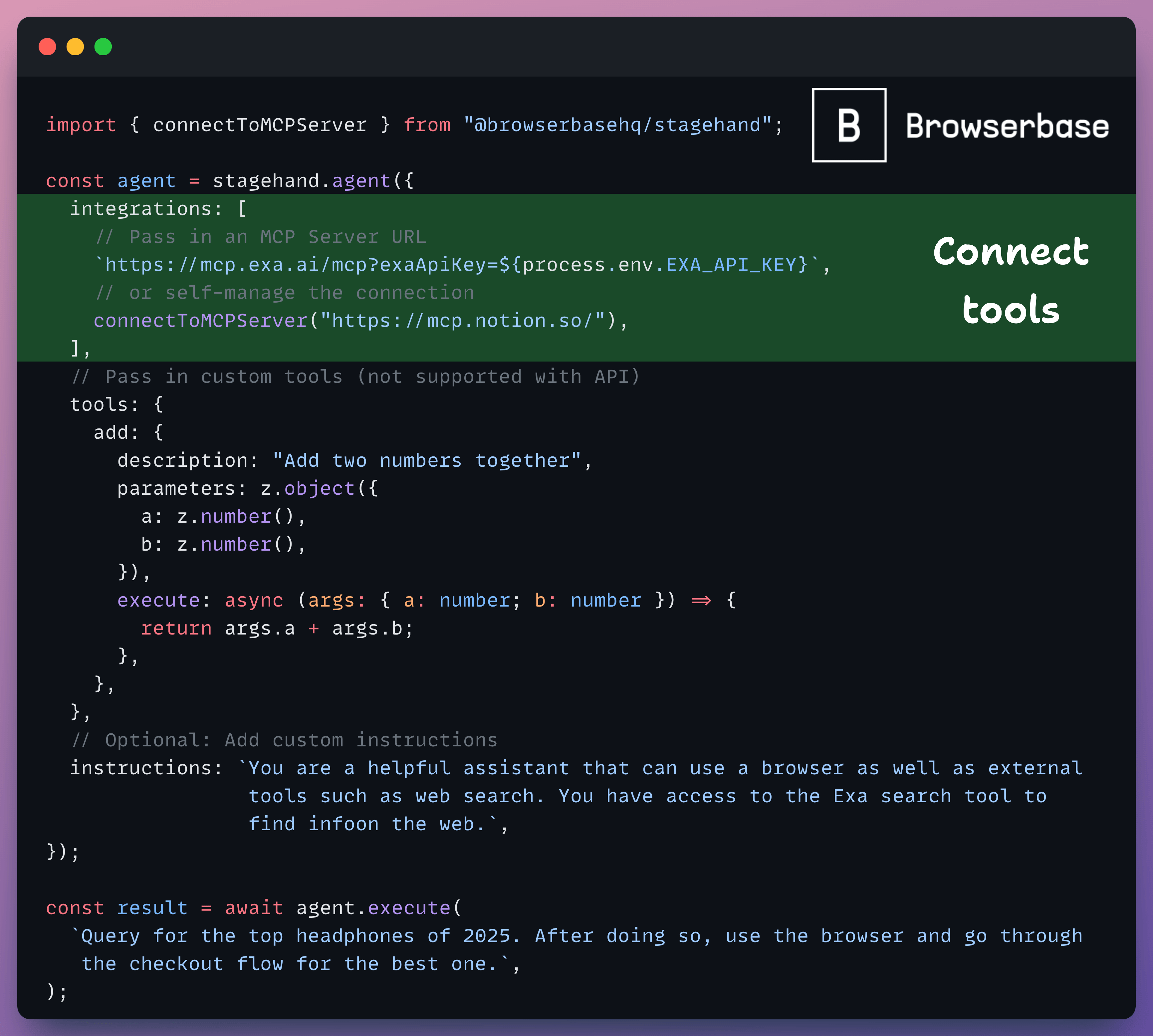 Your AI agents can now call external tools and integrate with any third-party service with Stagehand.