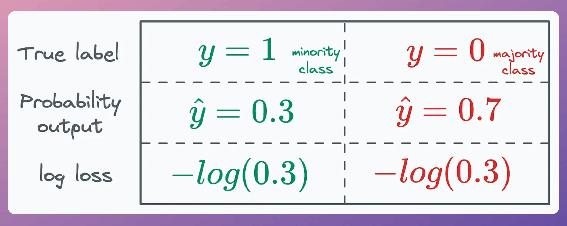 This means two instances, one from the minority class and another from the majority class, get assigned the same loss value if the probabilities are equal: