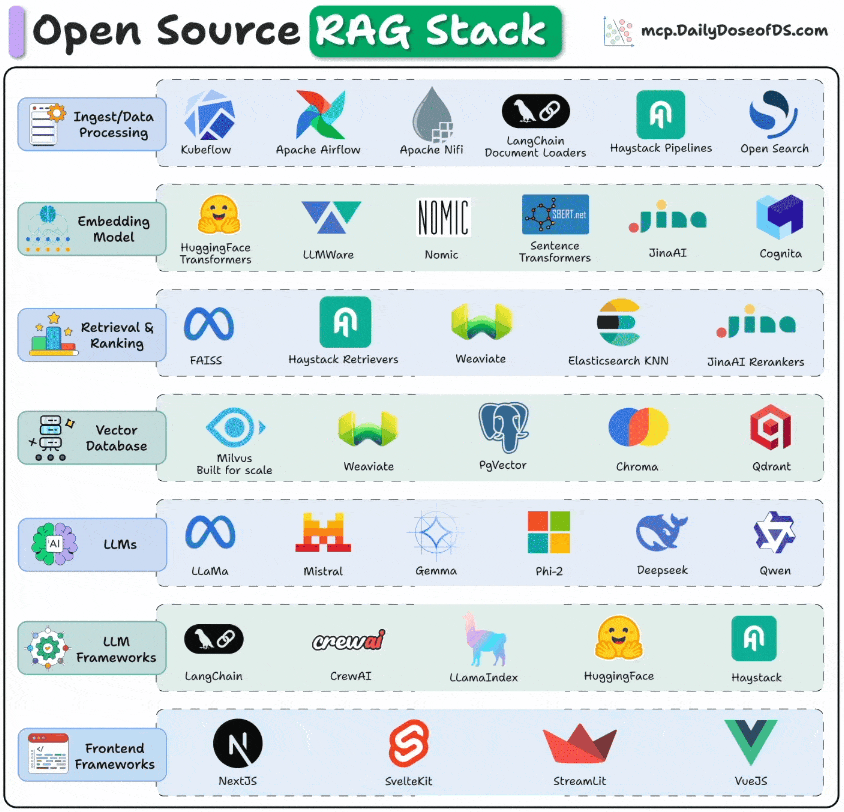 Retrieval & Ranking: LLM's output is only as good as the context you feed in, while also ensuring you maintain minimal latency. FAISS, Milvus, and Weaviate can help you get the right chunks, while rerankers like JinaAI fine-tune relevance.