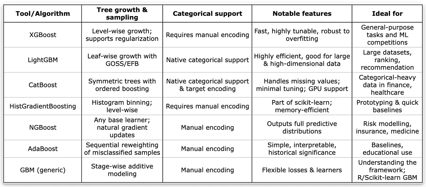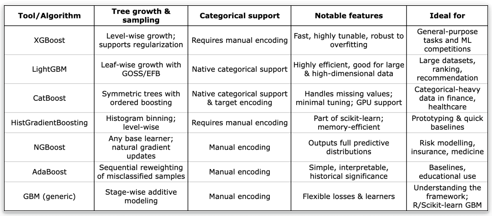 Of course, there are not the only gradient boosting methods. We’ve added a few more algorithms that extend or specialize the original gradient boosting framework, each with unique design choices that make them well-suited for different types of data and use cases.