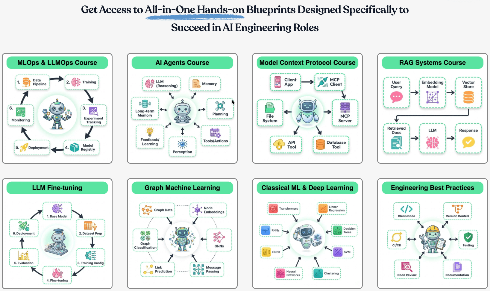 It gives you lifetime access to our all-in-one hands-on blueprints designed specifically to succeed in AI Engineering roles:
