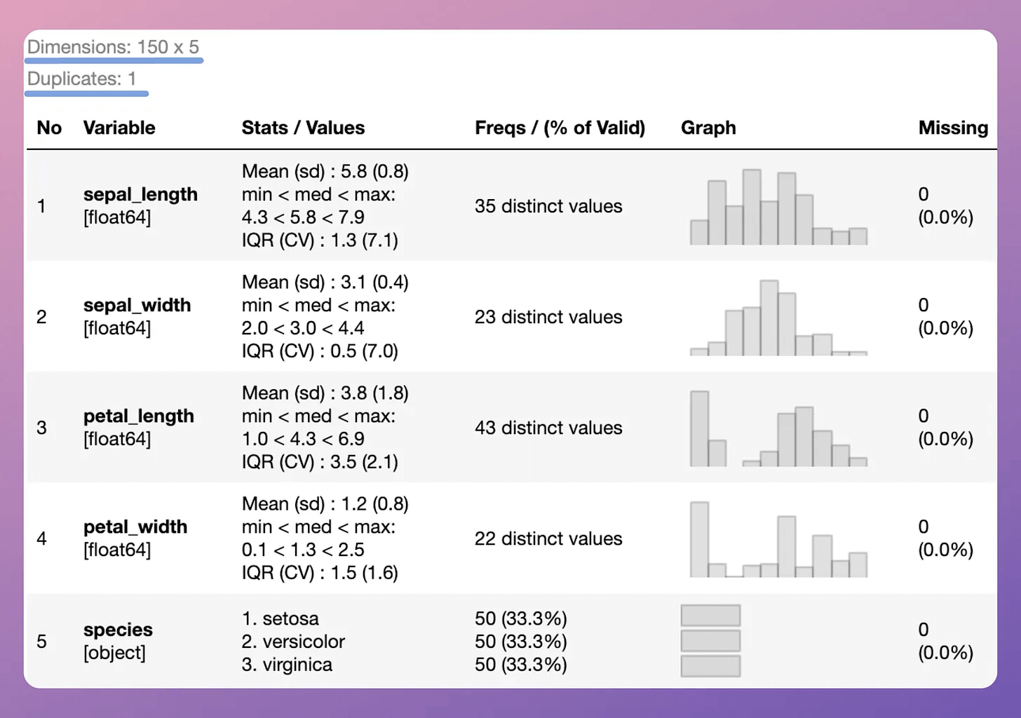 This includes data shape, column data types, column summary statistics, distribution charts, missing stats, etc., as shown below: