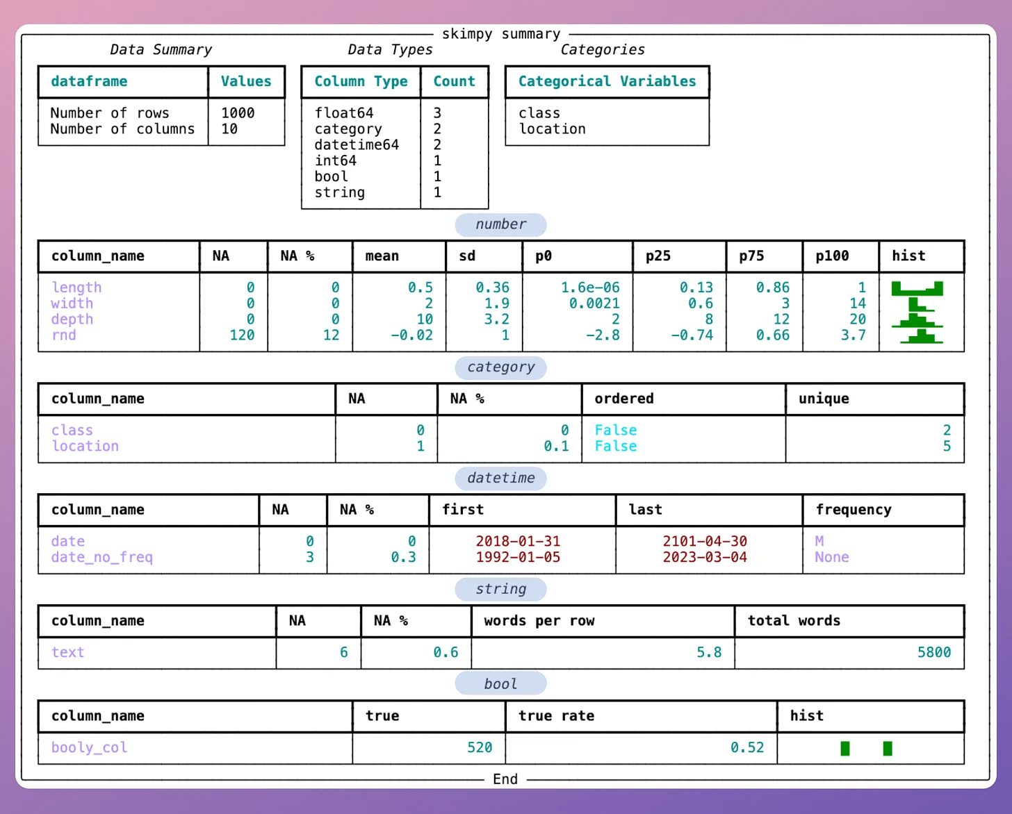 One thing I love about Skimpy is that it works seamlessly with Polars, which I also use frequently: