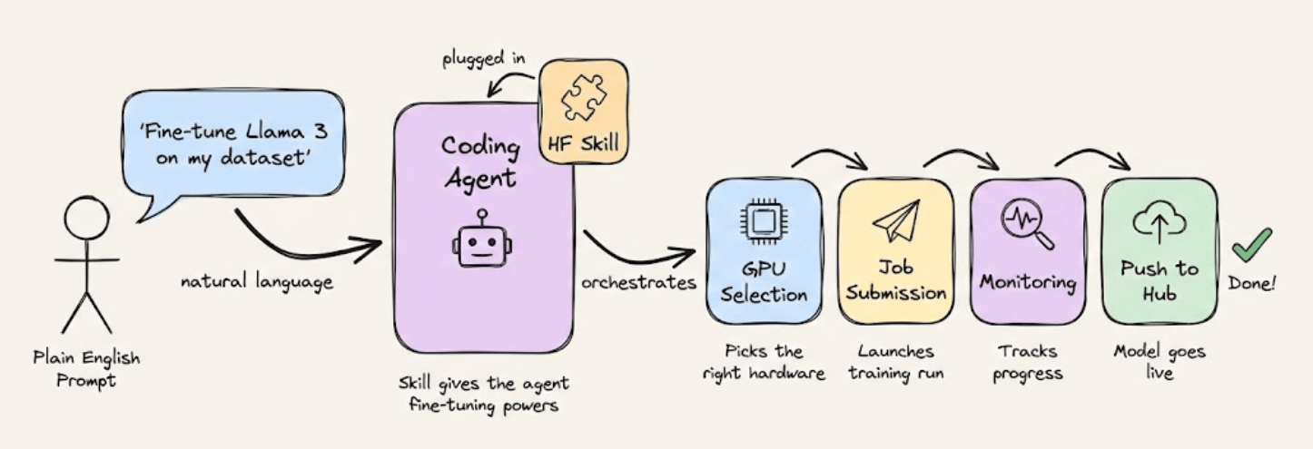 The agent handles GPU selection, job submission, monitoring, and pushes the finished model to the Hub.