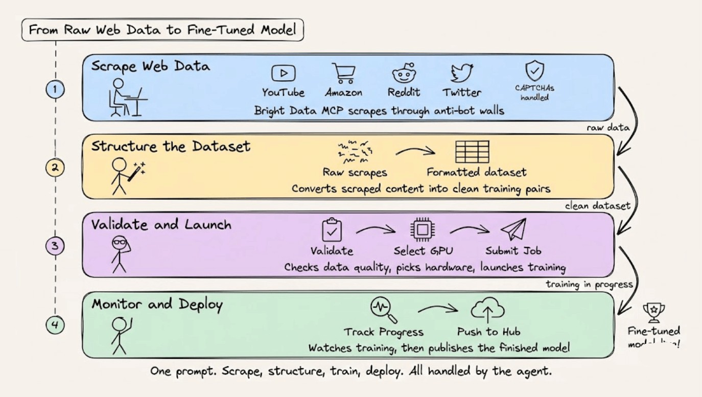So we integrated Bright Data’s Web MCP into the skill so that the coding agent can scrape data from the web before kicking off the training job: