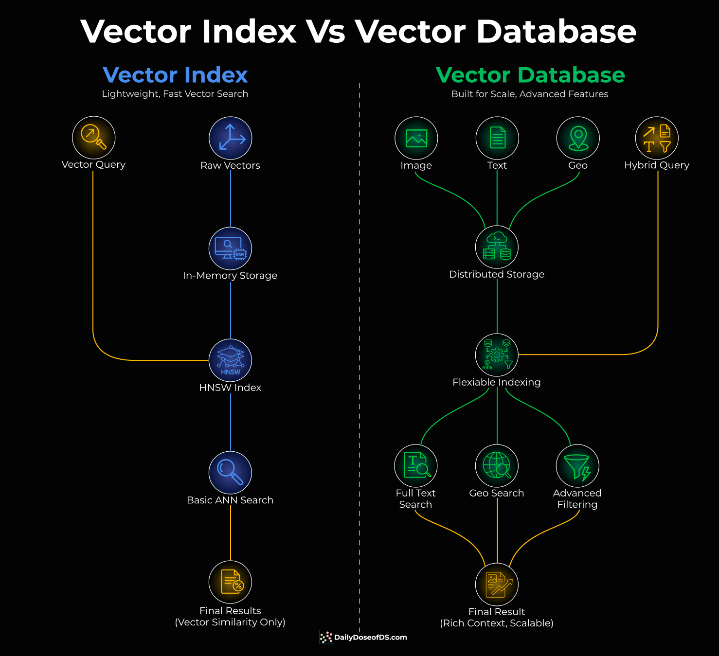 A vector database wraps that index with everything else you need, like distributed storage, metadata filtering, persistence, and concurrent access.