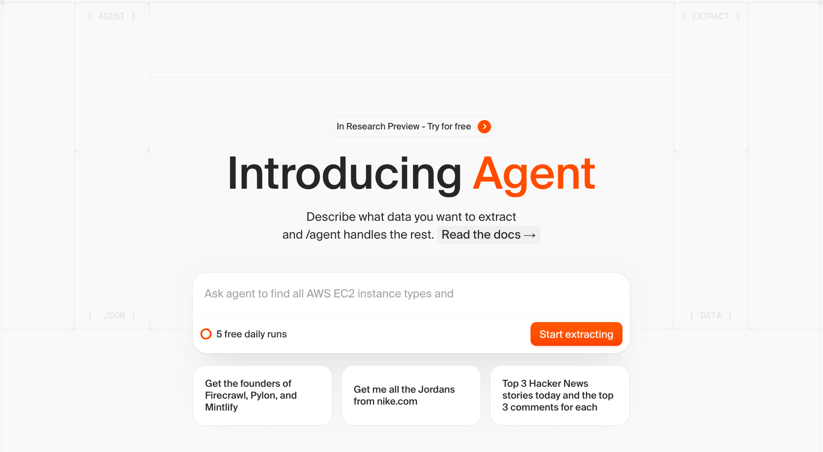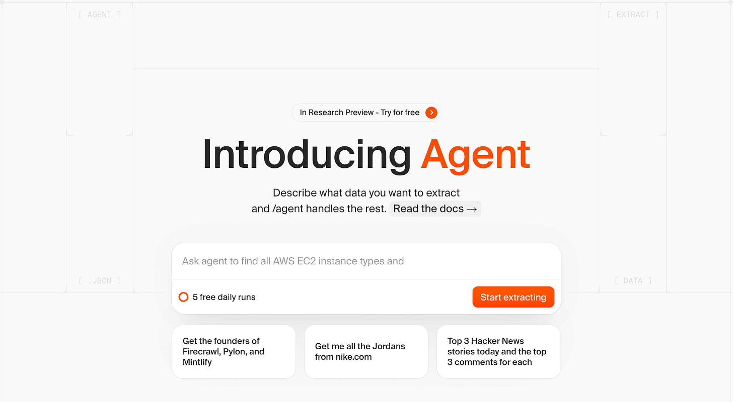 Firecrawl’s latest /agent endpoint lets you just describe what you need (with or without a URL), and then it searches, navigates, and gathers information from the widest range of websites, reaching data no other API can.