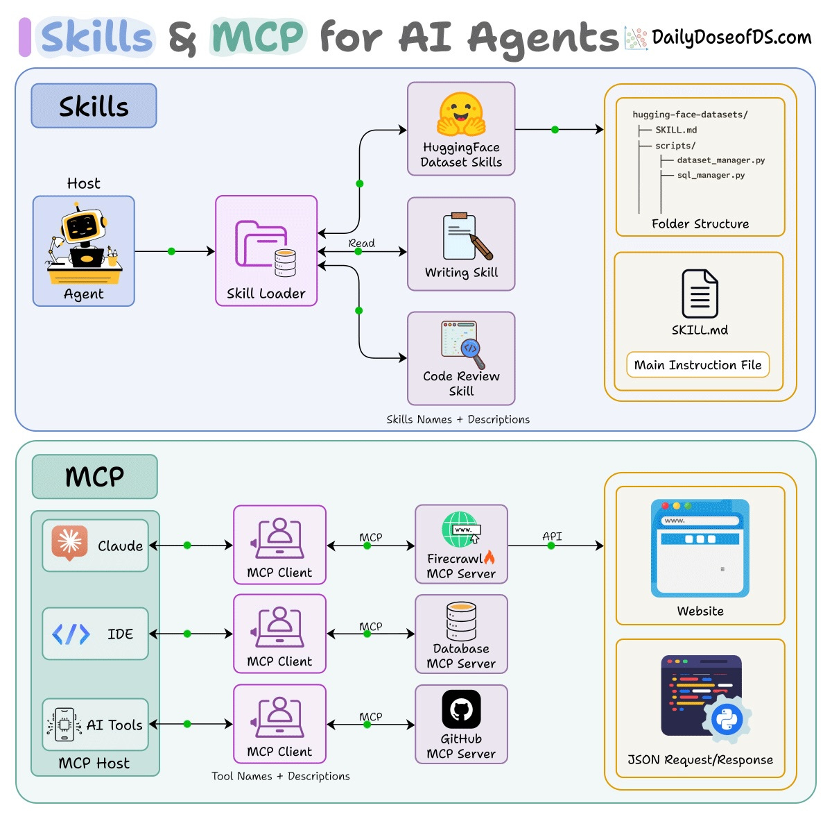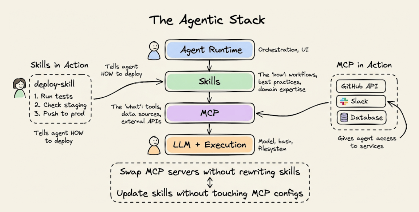 A skill might instruct the agent to use a specific MCP server, define how to interpret its outputs, and enforce safety checks before destructive operations. You can swap MCP servers without rewriting skills, and update skill instructions without touching MCP configs. The two layers are fully independent.