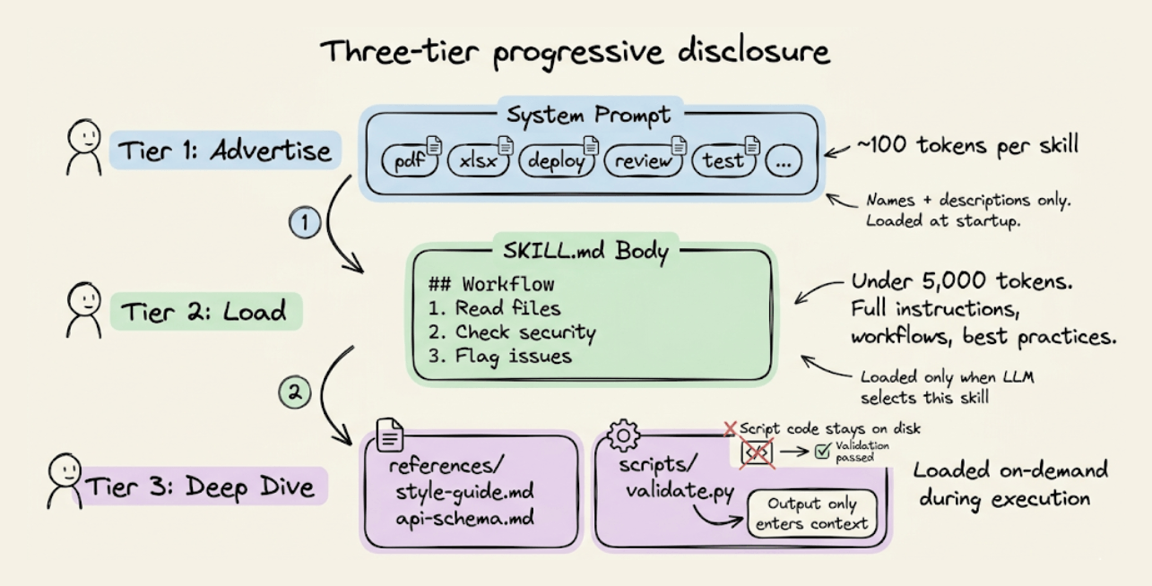 Skills use a three-tier loading system that keeps context costs proportional to what the agent uses, not what it has installed.