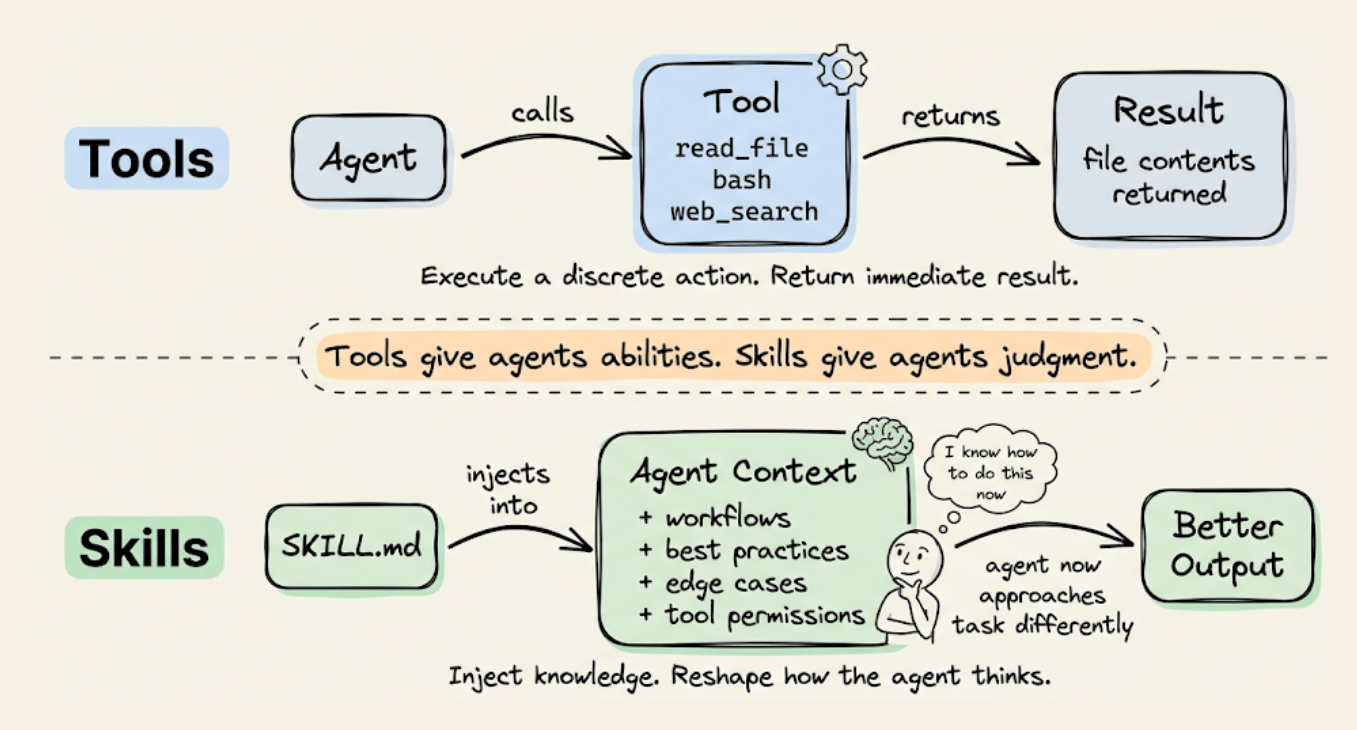 This is also why skills aren’t tools. Tools execute discrete actions and return results (read a file, call an API). Skills inject specialized instructions into the agent’s context and reshape how it approaches the task. A skill prepares the agent to solve a problem rather than solving it directly.