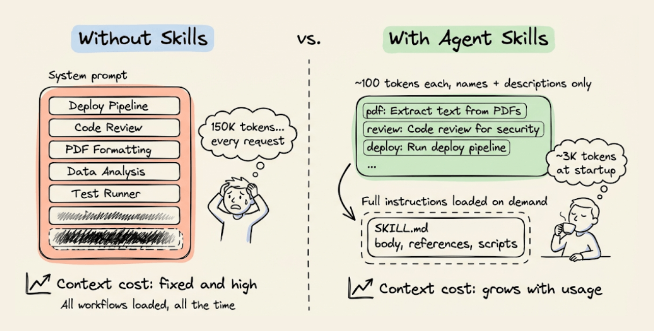 With Agent Skills, that drops to around 3,000 tokens at startup. The agent knows what skills exist, but loads full instructions only when the current task needs them.