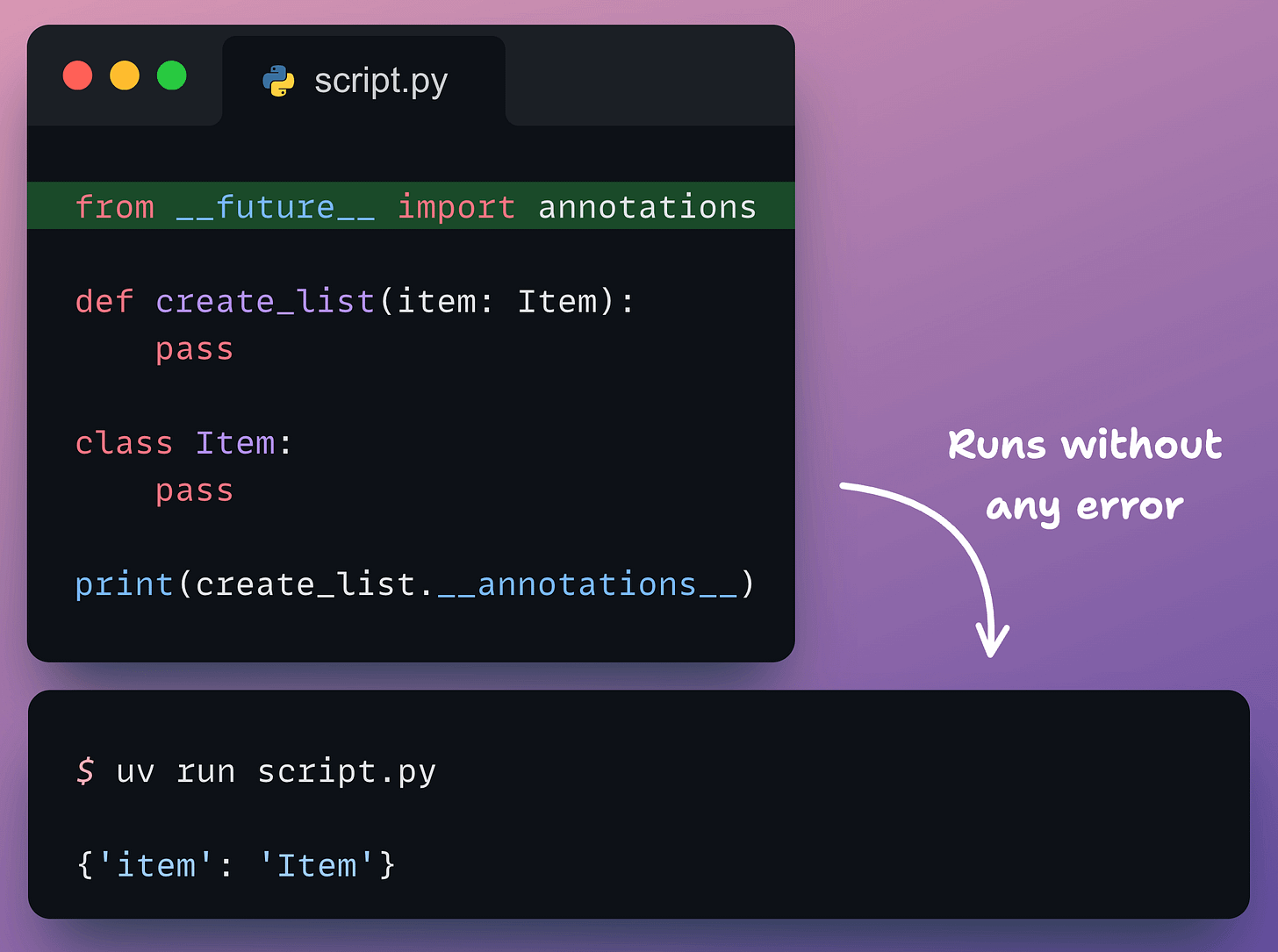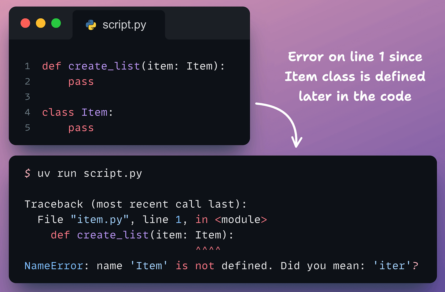 Traditionally, Python would try to resolve a type hint (like a class name) the moment it read the line of code. So if the class was defined later in the code, you got a NameError