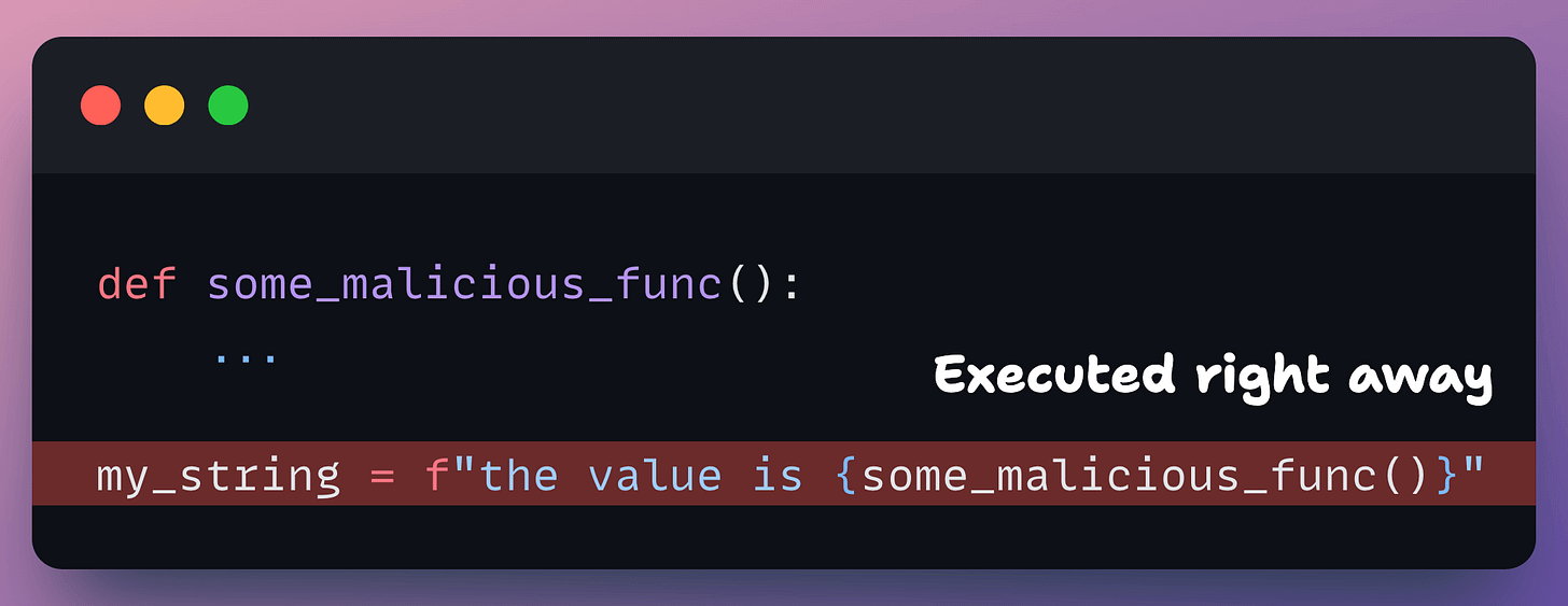 Traditional f-strings immediately execute expressions, which can be problematic if the expression contains malicious code or unescaped HTML/SQL from user input.