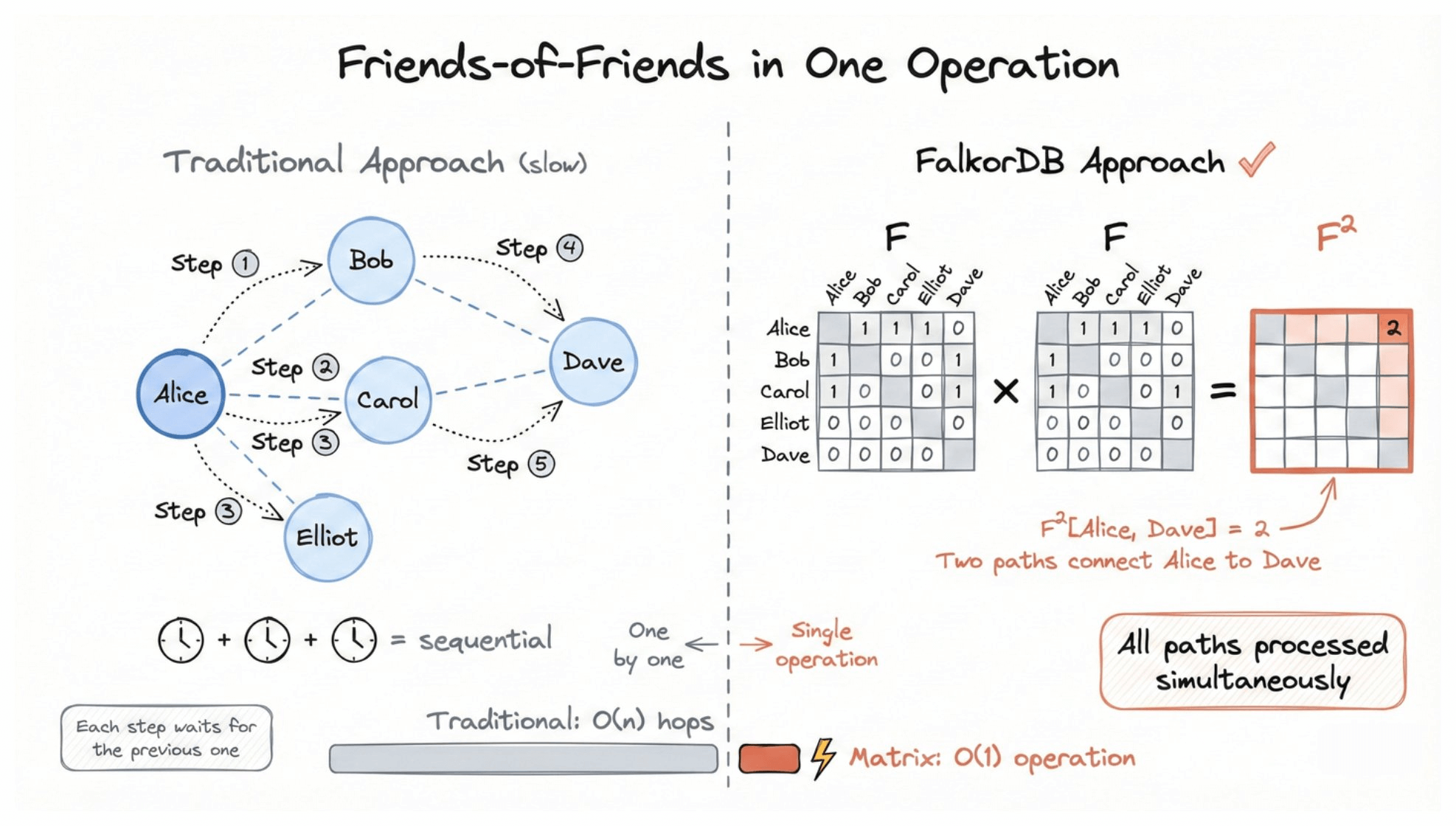 Traditional approach: start at Alice. Find her friends (Bob, Carol, Elliot). For each friend, find their friends. Combine results. Each step is sequential.