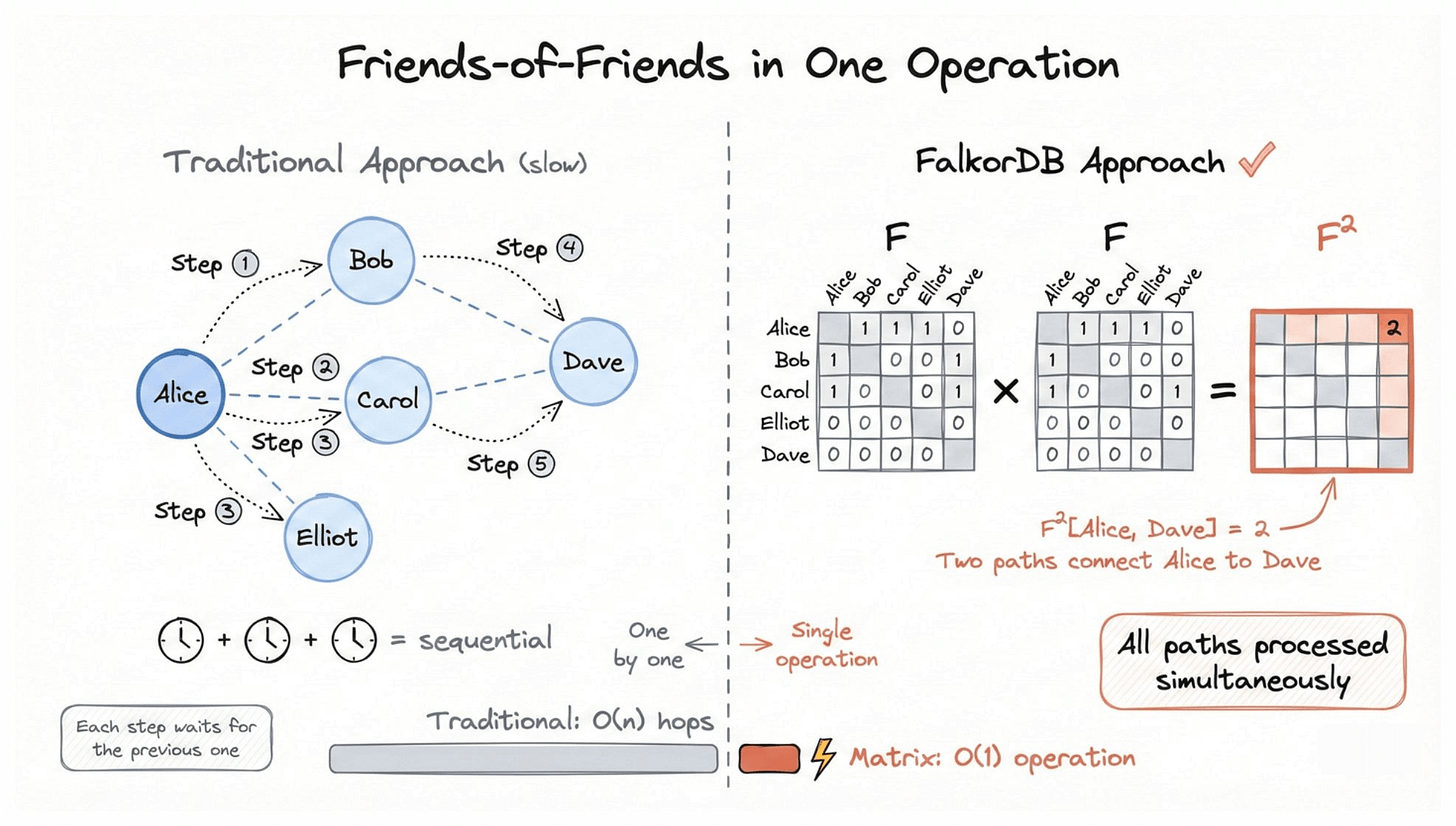 FalkorDB approach: represent the social graph as a matrix F where position [i,j] = 1 if person i is friends with person j. Finding friends-of-friends becomes a single matrix multiplication: