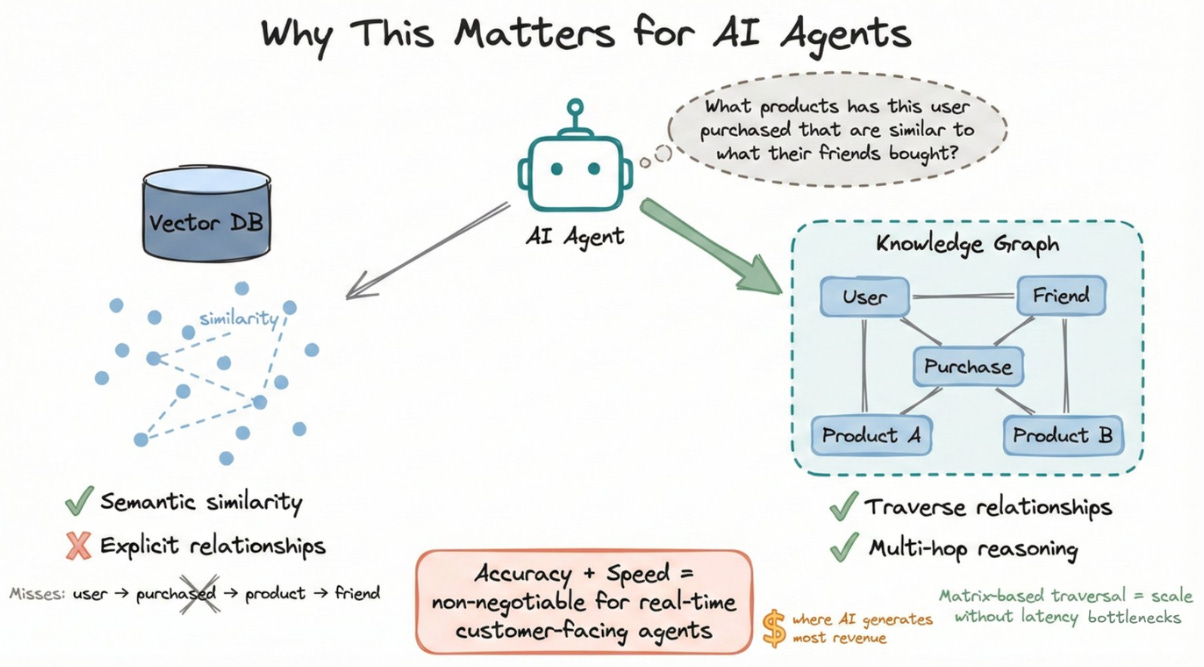 When your agent asks “what products has this user purchased that are similar to what their friends bought?” that requires traversing relationships, not just embedding similarity.