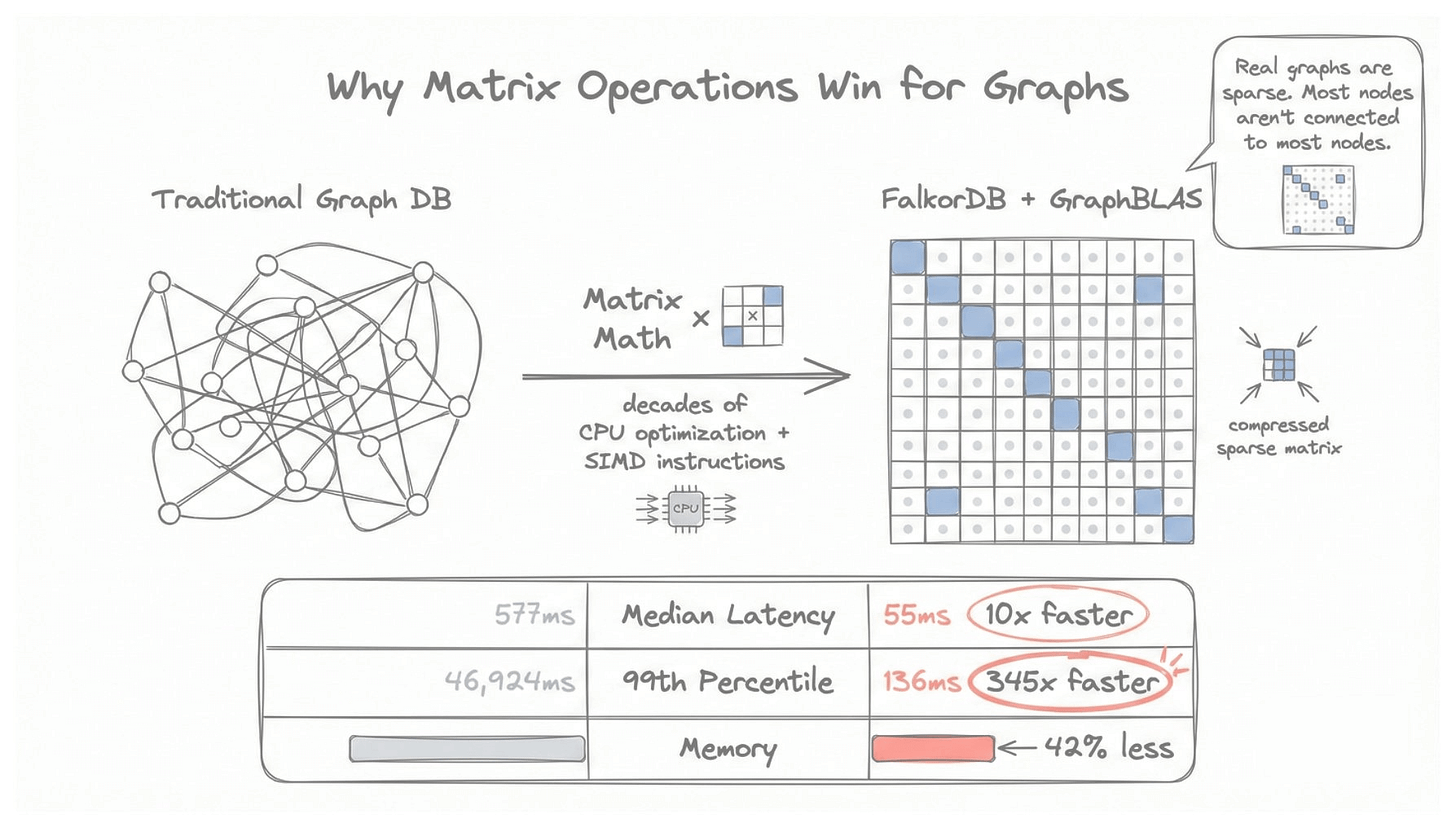 It’s an open-source graph database that represents your entire graph as a sparse matrix. Instead of chasing pointers, it translates traversals into matrix operations and does this in parallel.