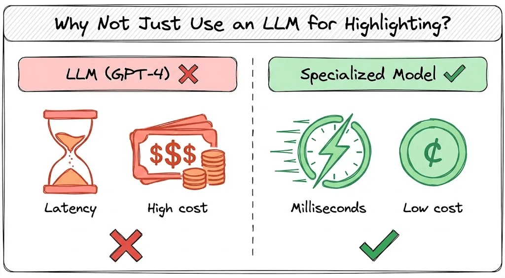 Highlighting happens on every query, across multiple documents. You need results in milliseconds. Running an LLM call for every highlight operation would destroy response times and explode your API costs.