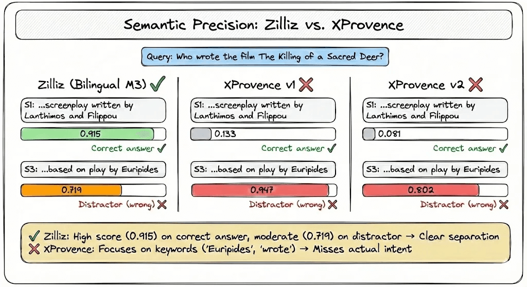 The Zilliz model understands the difference between “wrote the screenplay” and “wrote the source material.”
