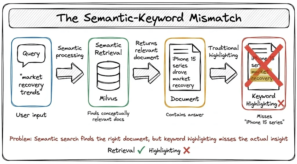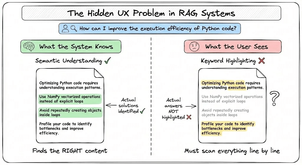Most systems fall back to keyword highlighting. They simply highlight words that match your query. And this creates a mismatch:
