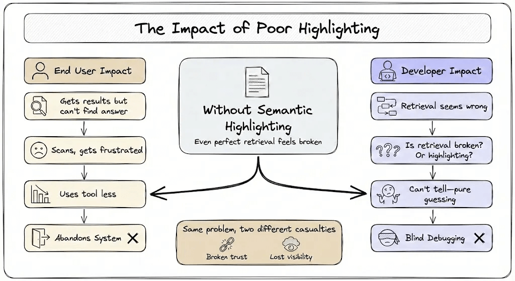 Developers lose visibility into their pipelines. When retrieval seems wrong, is it actually wrong or did highlighting simply fail to surface relevant content? Without semantic highlighting, debugging becomes guesswork.