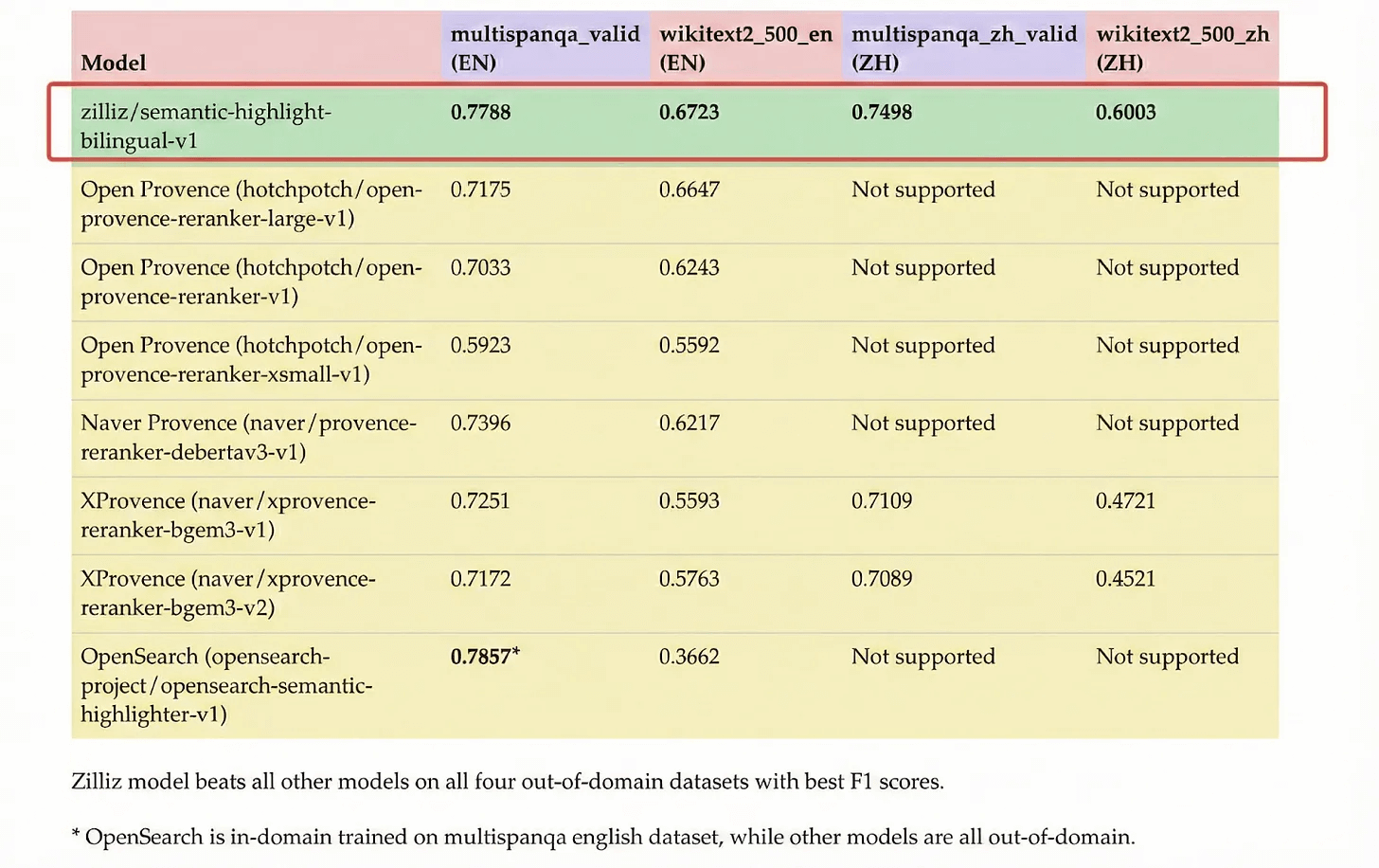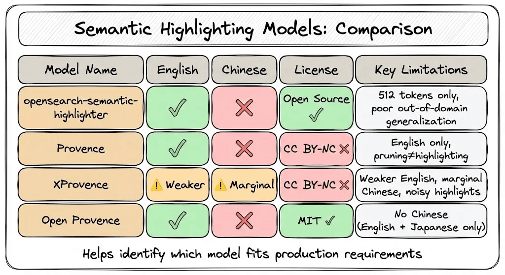 opensearch-semantic-highlighter: Limited to 512 tokens with out-of-domain F1 dropping from 0.72 to 0.46, and supports English only.