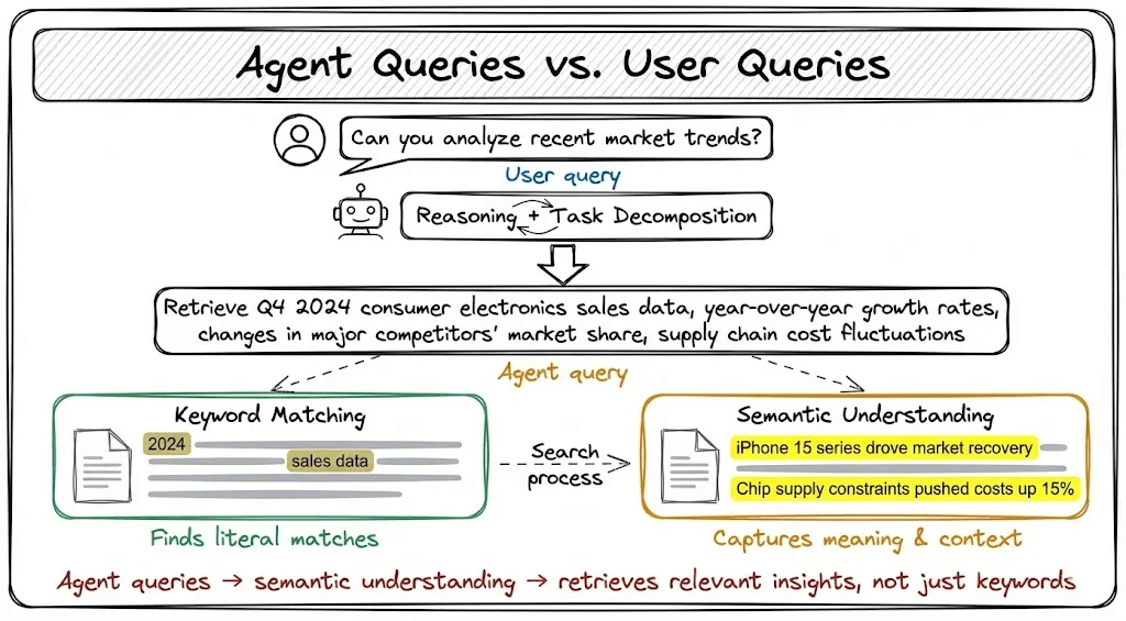 The agent doesn’t search those exact words. It reasons and generates a derived query: