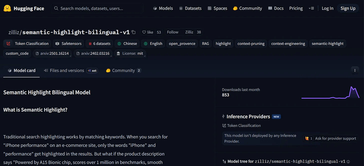 The model is being integrated into Milvus as a native Semantic Highlighting API. When Milvus retrieves documents, it will automatically surface the most relevant sentences, making it clear where the answer is.
