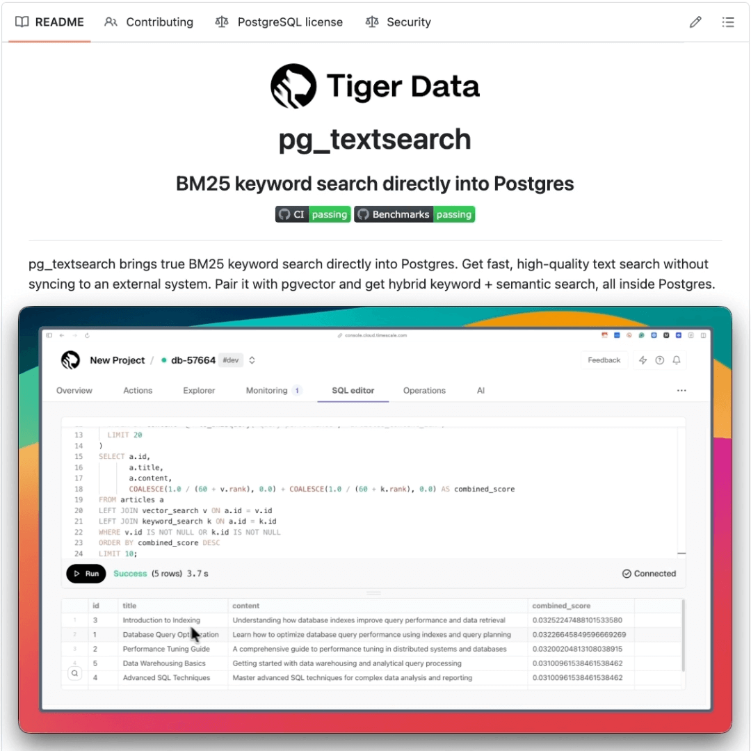 The bigger story: pg_textsearch pairs naturally with pgvector for hybrid retrieval. Keyword search + vector similarity in one database, which is exactly what RAG apps need.